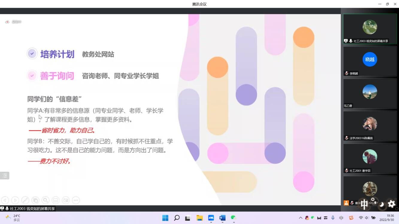 陈妍宇从课内与课外两个角度,提出注重课外自主学习,积累碎片化知识,以及参加员工工作充实老员工活三点建议。唐刚从课程学习、科研与竞赛和员工工作讲解,重点分享了申报大创项目的注意事项,以及准备学科竞赛的实用技巧。陈佩茹从大一的各门课程内容以及任课教师的教学特色出发,提出针对性的学习建议,同时分享了自己论文写作、考证等经验,鼓励新生积极参与社会实践,提升自己,服务他人和社会。谢宇田认为要充分利用图书馆、学校数据库资源等检索学习资料,拓宽知识来源,广览专业文献,提升专业能力。钱奕如认为要及时关注学校和学院的培养方案,提升信息通达度,并现场演示查阅文献的操作步骤。