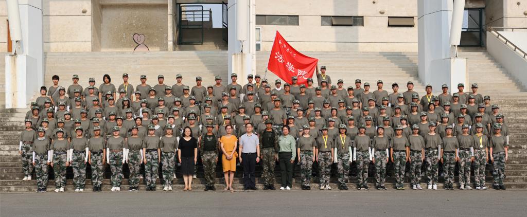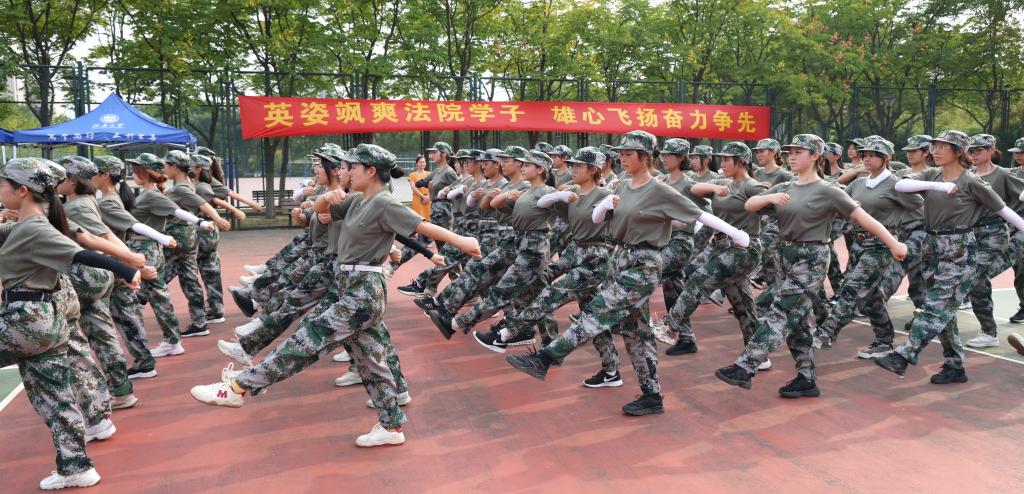 活动开始前,二营八连的教官带领同学们向领导和老师汇报军训内容。同学们迅速整队,出色地展示了稍息、立正、齐步走、跑步走、正步走等各项军事技能,在高喊“厚德明法、载道济世”的院训口号中展现出严谨认真的训练作风和斗志昂扬的精神面貌。