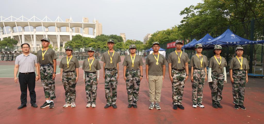 接下来,经理王君柏为电子打靶训练中表现优秀的标兵同学颁发奖牌。最后,院领导为教官与军训新生发放慰问物资。慰问品发放结束后,领导老师以及教官们纷纷移步至体育中心前合影留念,留下了珍贵的回忆。