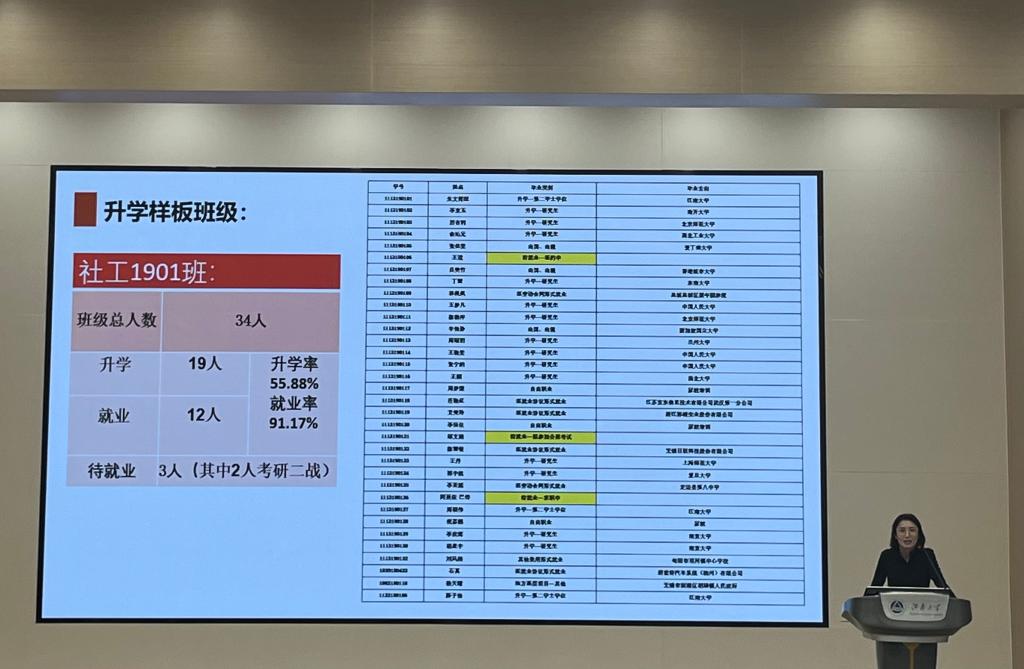 帕日旦木强调了召开本次年级大会的重要性,介绍了保研、考研、出国、就业等多种毕业去向选择,详细讲解了不同方向的优势和注意事项,强调了考研深造的必要性。她向同学们展示公司近三年的考研保研数据并进行分析,进一步解释考研升学形势,倡导同学们根据自身情况,尽早明晰未来目标。她详细介绍了公司保研细则、考研升学院校选择、考研复习方式方法等相关信息,并以社工1901班作为升学样板班级,强调了班风学风对于同学们发展的重要性,表示希望大家以社工1901班的学长学姐们为榜样,延续云顶国际的团结上进的优良传统,在升学上全力以赴,再创佳绩。紧接着,帕日旦木老师详细介绍公司学科竞赛情况,鼓励同学们积极参加各类学科竞赛和海外游学交换项目,提升自己的专业能力和综合素质。同时,详细介绍党员发展流程,鼓励同学们扎实学业基础,提升政治觉悟,为成为一名合格的员工党员做好准备。她强调安全防范、校规校纪等安全稳定方面的内容。在安全防范方面,她叮嘱同学们针对宿舍安全隐患、校园安全、诈骗等内容提高警惕,作为法员工应从根本上树立防范意识;在校规校纪方面,对违反校纪校规的行为与处罚方式进行了介绍,着重强调考勤、请假制度,引导同学规范自身行为,杜绝出现违反校纪校规现象;在日常管理主题中,强调有问题及时上报,进行高效率联结与沟通,提升日常管理的质量与效率。最后,她希望同学们做好个人生涯规划,为大四顺利毕业做好准备。