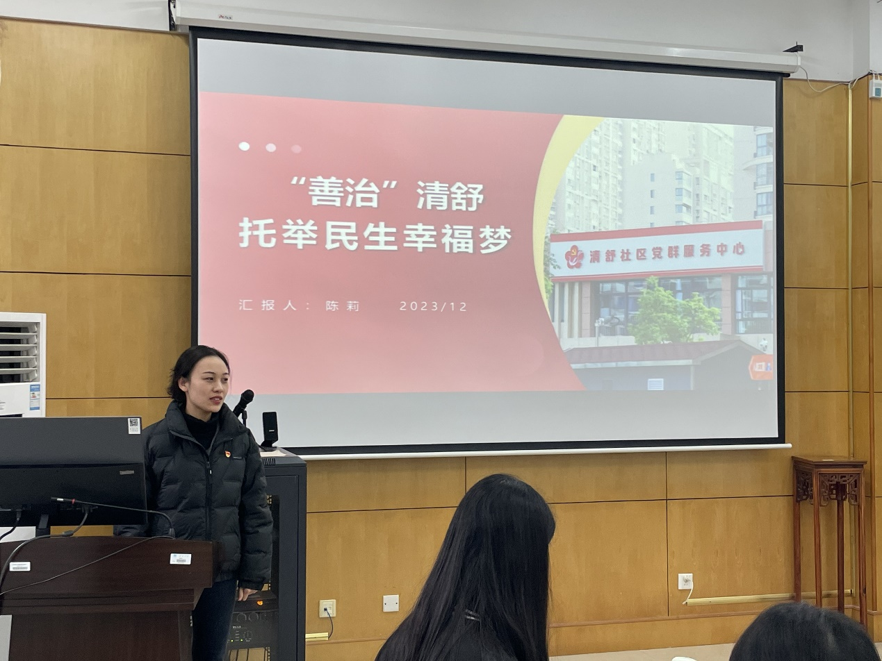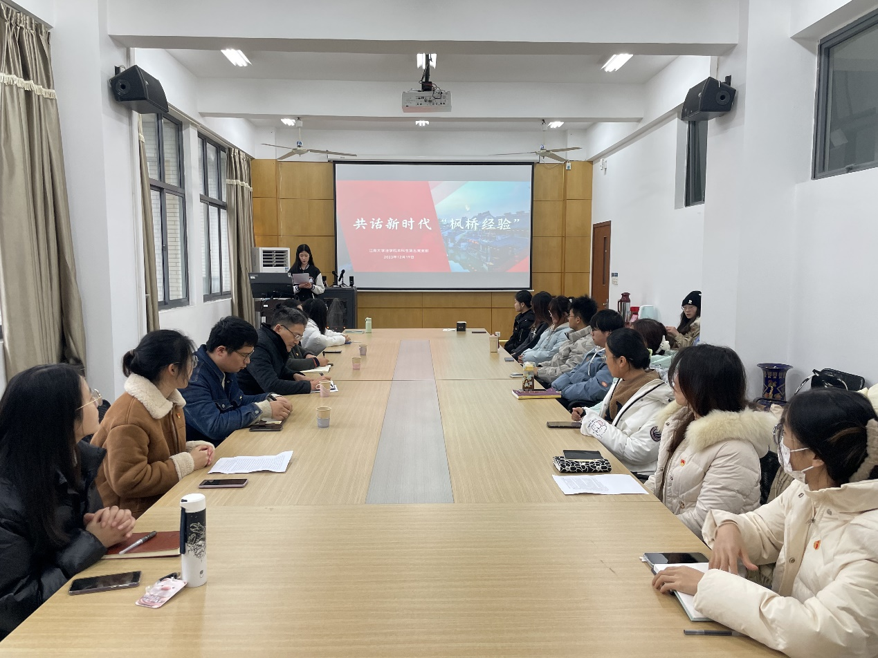 首先,党支书李泽真和组织委员李小璐以“学习‘枫桥经验’,用党员智慧助力社区治理”为主题领学,介绍了“枫桥经验”的历史由来、发展、基本概念和实践特征,从社会工作专业特色出发为大家讲述了青年党员如何发展新时代“枫桥经验”。新时代的枫桥故事被全国各地书写,民生无小事,青年党员责任在肩。第二个环节是“实践‘枫桥经验’,用青年行动丰富伟大实践”。支部党员杜雨浓、蒋蓝、钱奕如结合自身社会实践和科研经历分享了“枫桥经验”应用成果。杜雨浓谈及乡村基层治理相关问题,提出以利他主义的关怀帮助实现乡村的精神治理,为社会工作的本土化路径探索提供可行方案;蒋蓝以社区社会组织的培育和发展现存问题为切入点,探究“枫桥经验”在社会新变化与人民新诉求背景下的新应用;钱奕如通过社区调研发现了当下社会治理重心向基层下移、社区服务水平不断提升的现状。随后,支部邀请到华庄街道清舒社区陈莉为党员同志们做“对话‘枫桥经验’,从基层工作践行为民宗旨”的主题分享。陈莉负责社区的党务与宣传工作,她以“党建引领基层治理”为主旨介绍了当前清舒社区工作“全科窗口建设”的新特色,并与同学们交流了社区工作中可能出现的问题与解决方法。