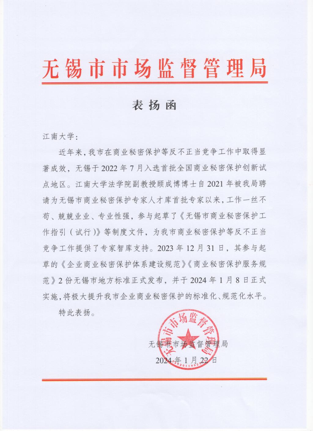 近日,公司收到无锡市市场监督管理局致顾成博副教授的表扬函,对其在商业秘密保护等反不正当竞争工作中的积极贡献予以表扬。