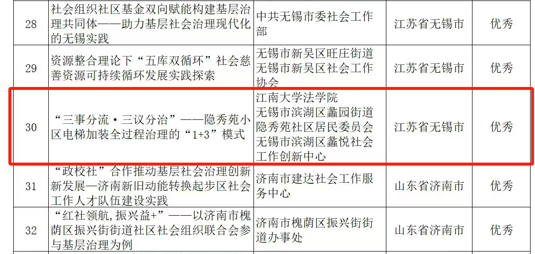 近日,由北京师范大学中国社会管理研究院和中国社会工作联合会联合发起的首届“全国社会工作和社会治理创新”典型案例征集活动,该活动得到人民出版社、新华社《半月谈》杂志社等单位的协助支持。经过征集、初审、复审、终审、答辩和复核六个环节,最终从全国近600个案例中评选出54个优秀案例,其中,云顶国际、无锡市滨湖区蠡园街道隐秀苑社区、无锡市滨湖区蠡悦社会工作创新中心联合申报的《“三事分流·三议分治”——隐秀苑小区电梯加装全过程治理的“1+3”模式》成功入选。