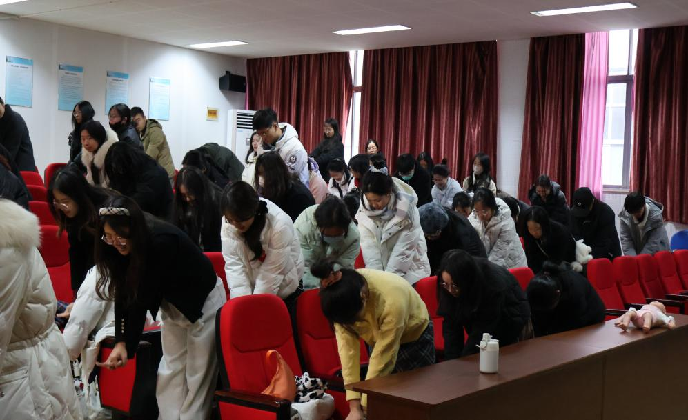 活动伊始,主持人为大家介绍了活动流程。随后,由无锡市红十字会的指导老师为大家进行了急救知识的科普,简要阐述急救教育的重要意义,指出掌握急救技能不仅是自救互救的基本能力,更是责任与担当的体现。紧接着,指导老师为大家带来了关于急救知识的实践教学。教学内容涵盖了晕厥的急救措施、气道异物梗阻的急救方法和心肺复苏的操作要点,并详细介绍了在突发情况下如何正确地进行应急救护。指导老师通过生动的案例和互动式教学,使同学们对急救知识有了更加直观和深入的理解。三种突发情况教学完毕后,指导老师带领同学们分成三组进入实操和互动环节。三组同学们分别在指导老师的带领下各自体验了急救晕厥、异物梗阻、AED的使用和心肺复苏的练习。