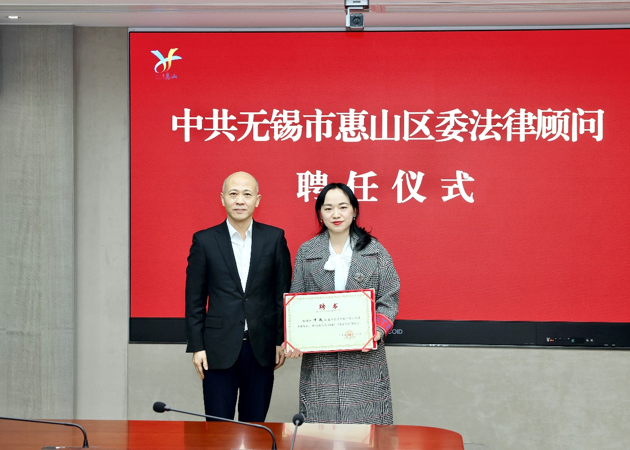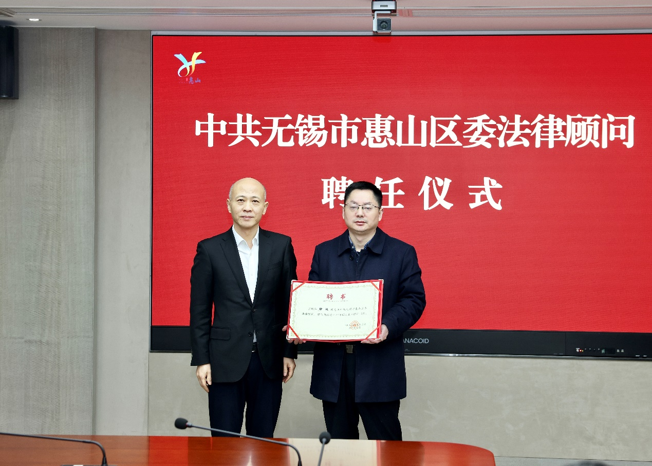 这是自2021年公司叶敏、浦纯钰老师受聘为中共无锡市惠山区委第二届法律顾问后,再次接受第三届区委法律顾问的聘任,不仅体现出区委对公司教师前一任期工作的肯定与信任,也是公司与惠山区委不断加强校地合作、充分发挥高校社会服务功能的又一举措。